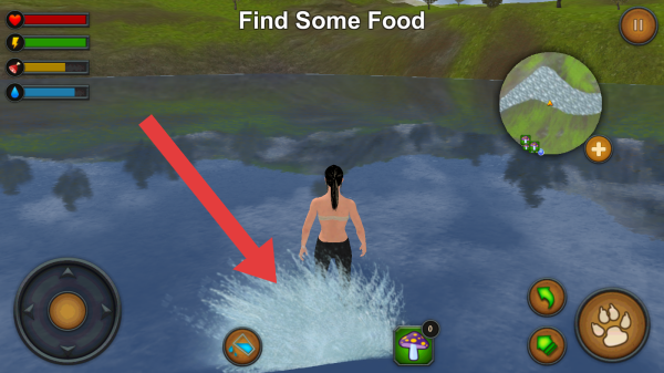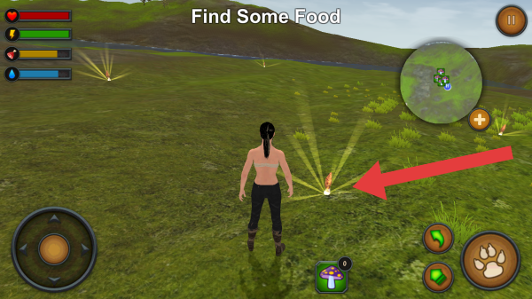 3、有血量、耐力、饥饿、水分等状态条,还有虚拟摇杆、动作按钮、地图、道具蘑菇图标等。