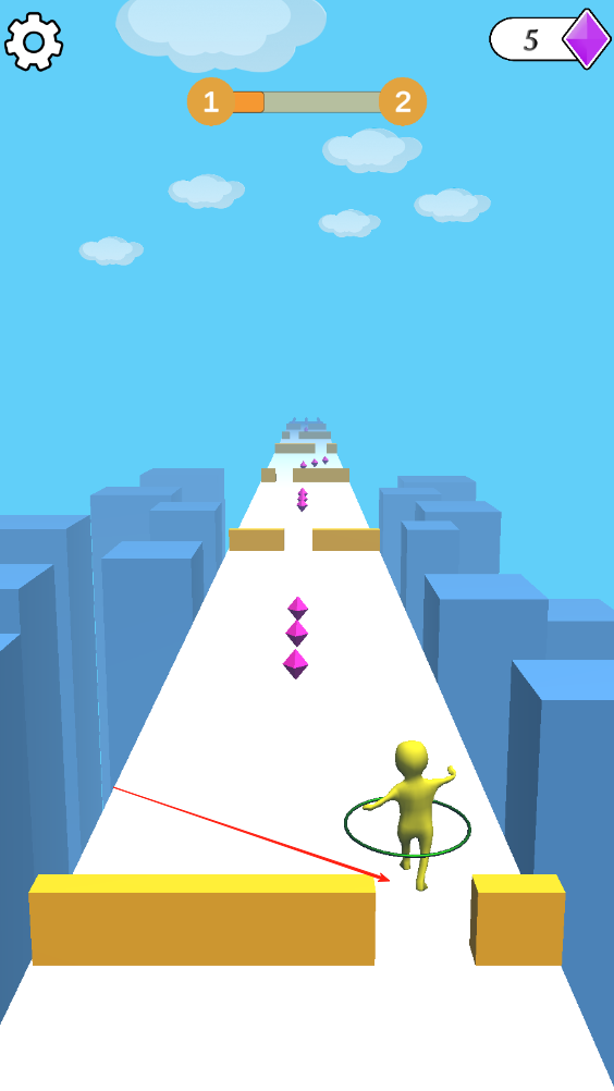 1、观察当前关卡的障碍分布和钻石位置,控制橡皮人启动呼啦圈并尝试向前移动,熟悉保持呼啦圈不掉落的基本操作。