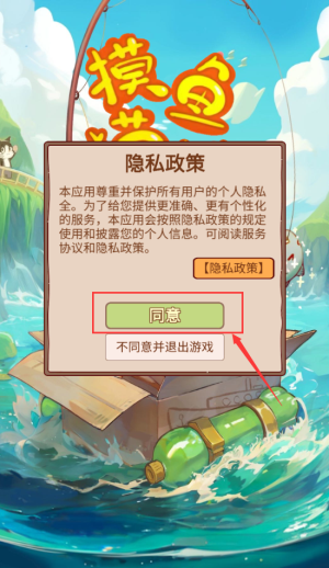 1、点击红框绿色同意按钮,确认隐私政策开始游戏。
