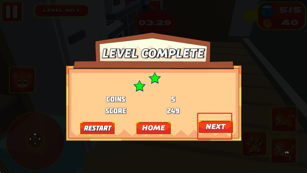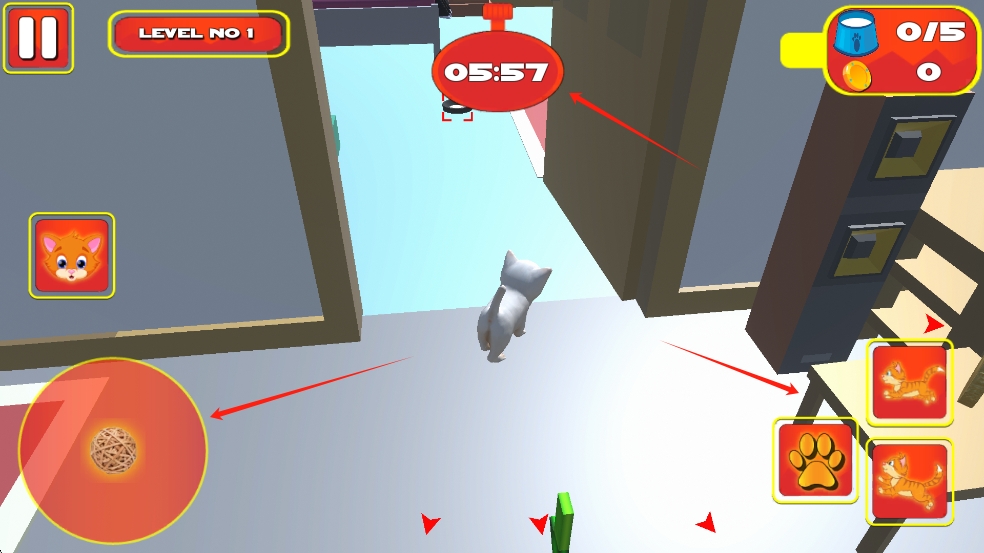 2、操控左下角摇杆移动猫咪,在限时内收集右上角目标物品,利用右侧技能按钮辅助,达成收集任务。