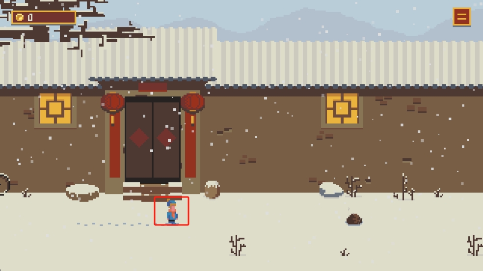 1、开局操控红色方框内的蓝色服饰角色,在雪地庭院移动,靠近道具栏物品与场景元素触发互动。