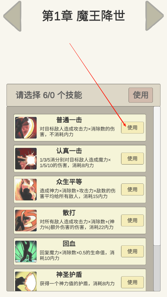 1、基础消除操作:通过点击相邻的相同元素或滑动屏幕连接三个及以上相同元素进行消除,消除后元素会消失并生成新的元素,持续为攻击魔王积累能量。