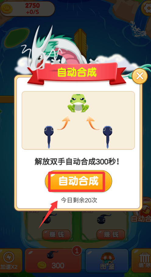 4、点击自动合成就会显示两个蝌蚪合成一个青蛙。