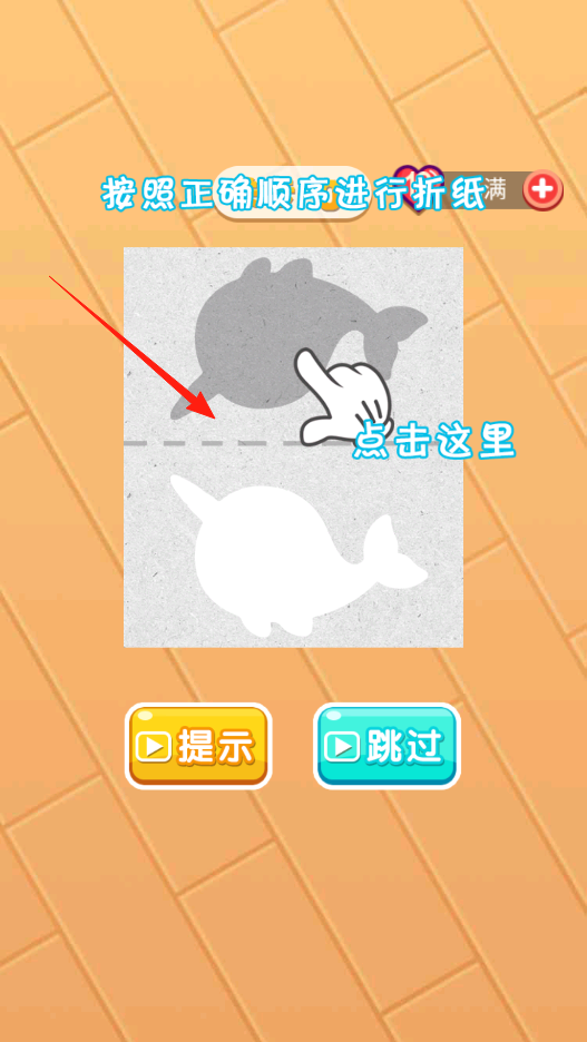 3、进入第二关,面对新图案,点击提示按钮,获取折纸步骤指导,依据提示,进行折叠操作,或选择跳过,尝试自主探索,根据提示机制,辅助完成挑战。