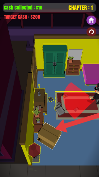2、画面显示处于第1章,已收集现金为10美元,任务目标现金为200美元,红色区域可能是警戒范围。