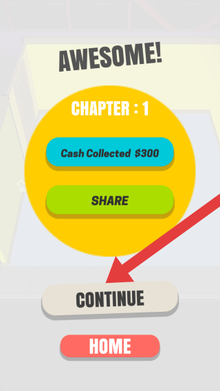 3、显示AWESOME!太棒了,当前第1章的目标以收集现金300美元,还有SHARE、CONTINUE、HOME按钮。