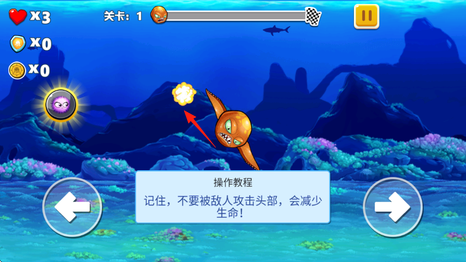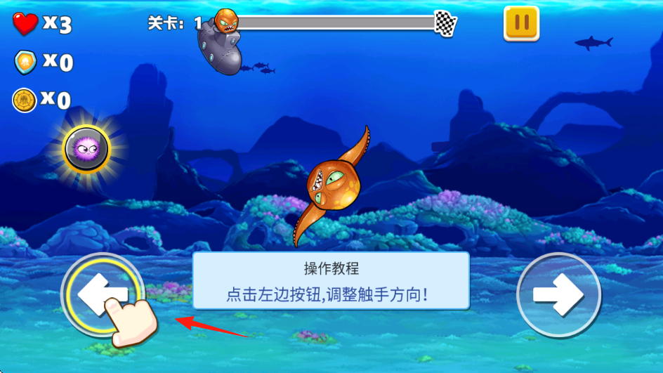2、提示点击左边按钮,调整触手方向,不要被敌人攻击头部,会减少生命,指导玩家操作。