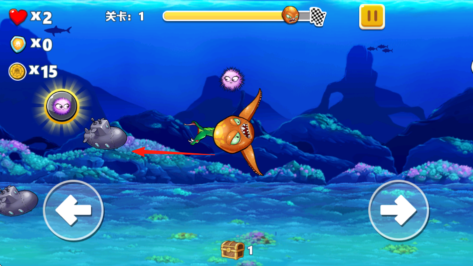 3、有橙色飞行怪、潜艇、鲨鱼、宝箱、紫色毛球道具,背景是海底场景珊瑚、礁石等。