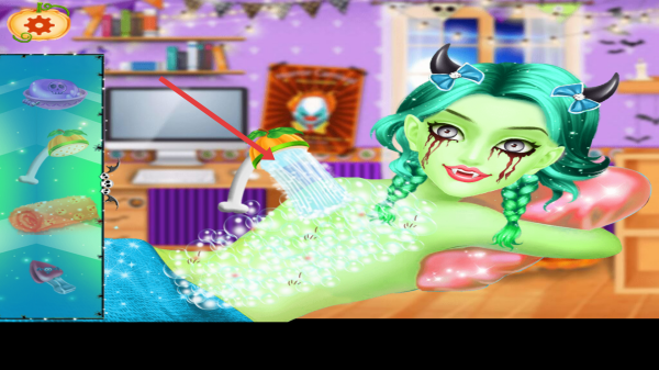 1、点开给有着万圣节装扮的角色进行打扮,首先从身体的清洁入手,点击紫色的香皂给后背清洁。