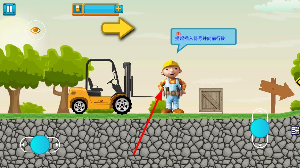 2、关卡中,按提示提起插入符号并向前行驶,操控角色,与叉车配合,完成操作。