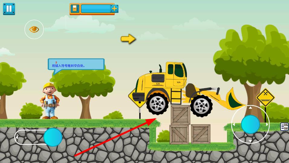 3、继续关卡,按提示将插入符号推到空白处,操控装载机,跨越障碍,推进任务。