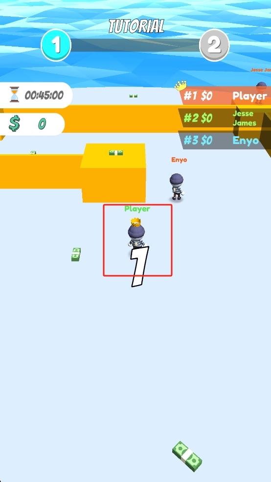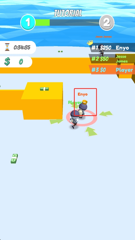 2、在地图移动收集散落美元,靠近排名领先的Enyo,通过互动抢夺其金钱,提升财富值,冲击排行榜首位。