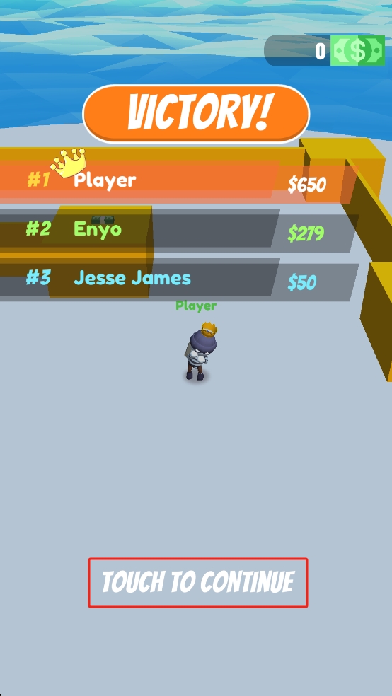 3、胜利后会显示本局的排名跟收益,然后我们点击TOUCH TO CONTINUE按钮,进入下一场竞技,继续与对手争夺财富。