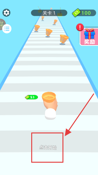 1、进入游戏关卡1界面,点击点击开始按钮,开启游戏挑战,在赛道上收集物品。