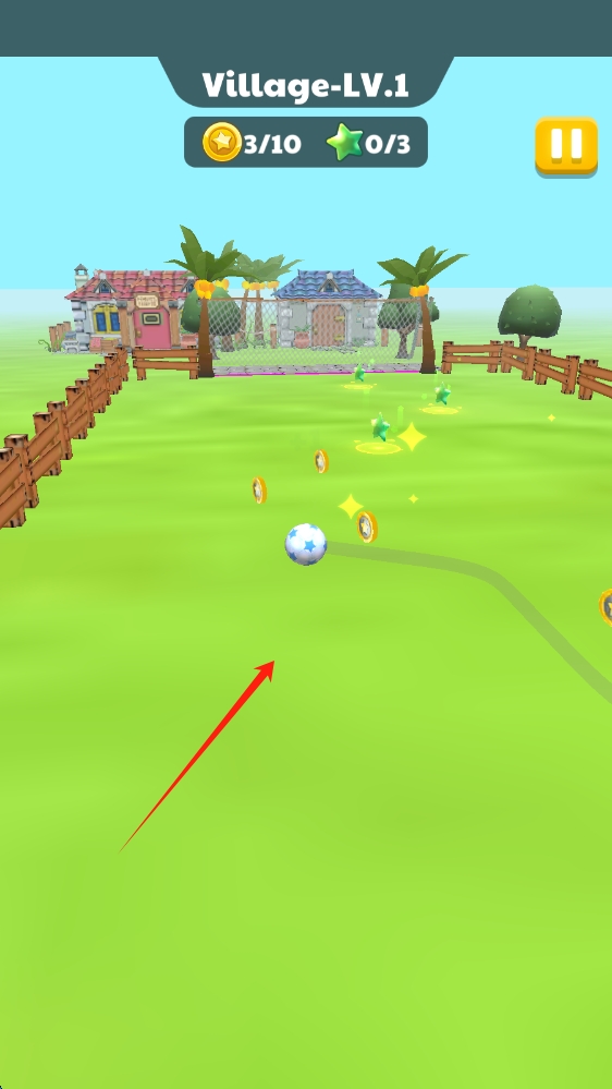 3、在VILLAGE-LV.1场景中,根据箭头提示,操作足球,收集金币和星星,完成游戏任务,滑动滚足球。