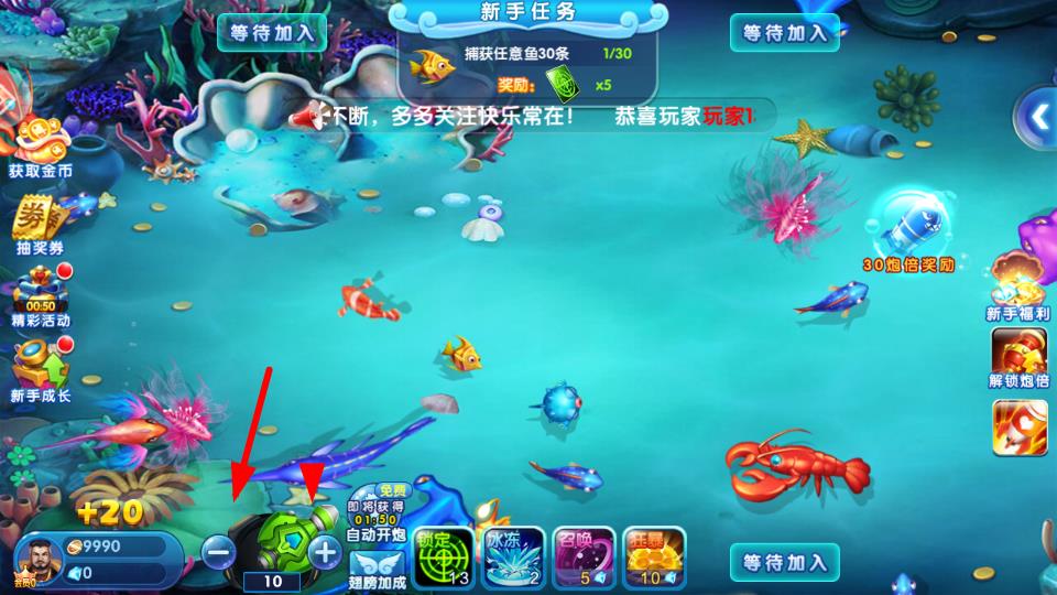 1、进入游戏后选择初始捕鱼工具与协助的葫芦娃角色,在引导下熟悉瞄准、发射渔网与使用葫芦娃技能的操作,捕捉首批鱼类完成入门挑战。