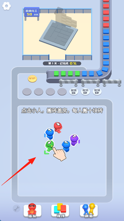 1、进入第1关,看到点击小人,搬砖盖房,每人搬十块砖提示,点击箭头指的绿色小人,使其开始搬砖。