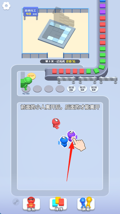2、等绿色小人离开后,按提示前面的小人离开后,后面的才能离开,点击箭头指的紫色小人,让其出发搬砖。