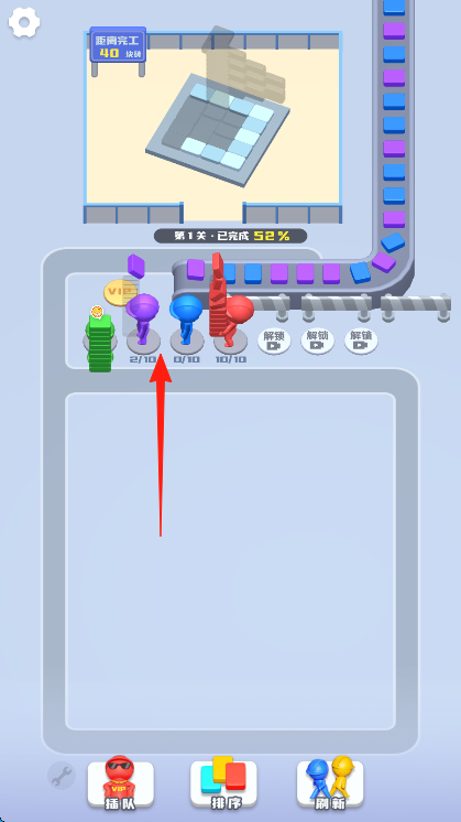 3、紫色小人出发后,后续蓝色小人按顺序,跟随箭头指引,到对应位置排队,依次送砖,推进盖房进度至完成。