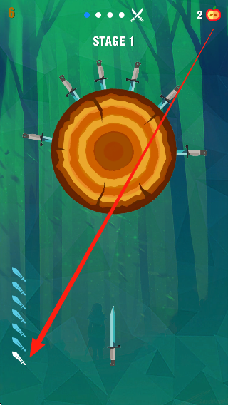 1、进入简洁画风场景,拿起飞刀学习投掷方法,练习瞄准靶心,准备开启首次挑战任务。