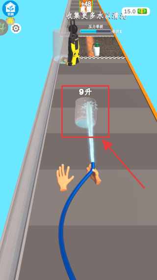 2、在游戏场景中,操控水管收集红色方框内标有9升的水桶,获取相应的水量,满足游戏任务需求。