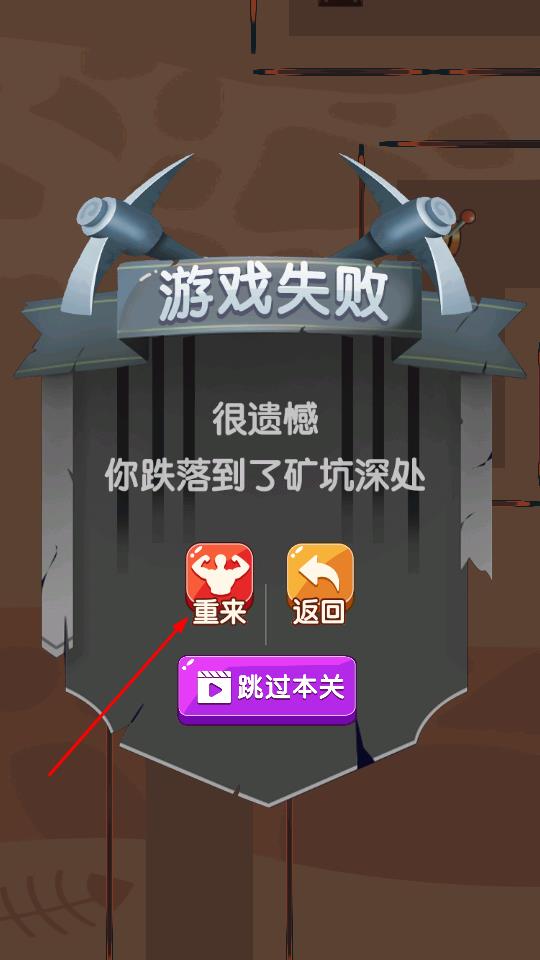 3、若跌落矿坑失败,点击重来按钮,可重新挑战本关,继续矿洞冒险,争取顺利通关。