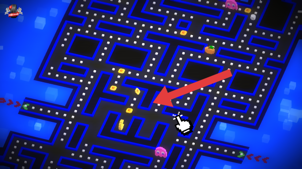 2、展示了经典的迷宫场景,有豆子、金币以及幽灵等元素,根据箭头指向的提示,是引导玩家操控吃豆人移动来收集豆子。