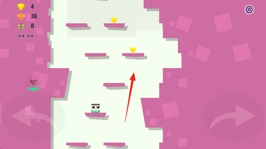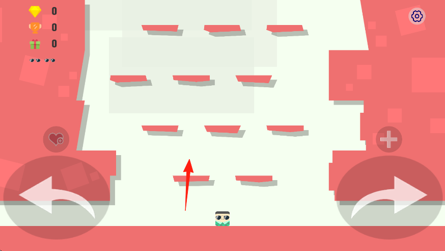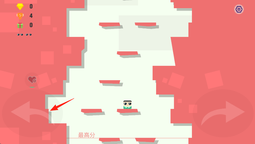 2、分层平台关卡,背景颜色红、粉区分阶段,左右两侧分别是左右跳跃,需根据平台显示位置精准点击。