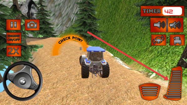 3、在驾驶拖拉机时,可以点击使用右侧踏板控制速度,沿山路行驶,抵达CHECK-POINT完成关卡任务。