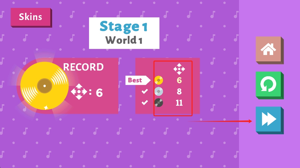 3、关卡结束后可以查看本局的音符收集记录,点击右侧蓝色箭头按钮即可进入下一关挑战更高难度。