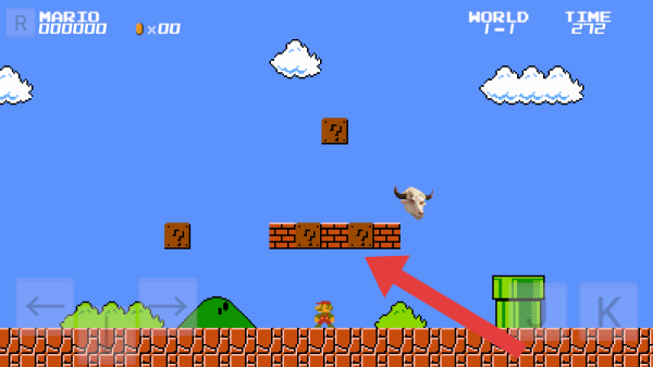 2、场景元素:砖块、问号方块、云朵、山丘、操作按键←、→、J、K,是经典的马里奥闯关关卡场景。