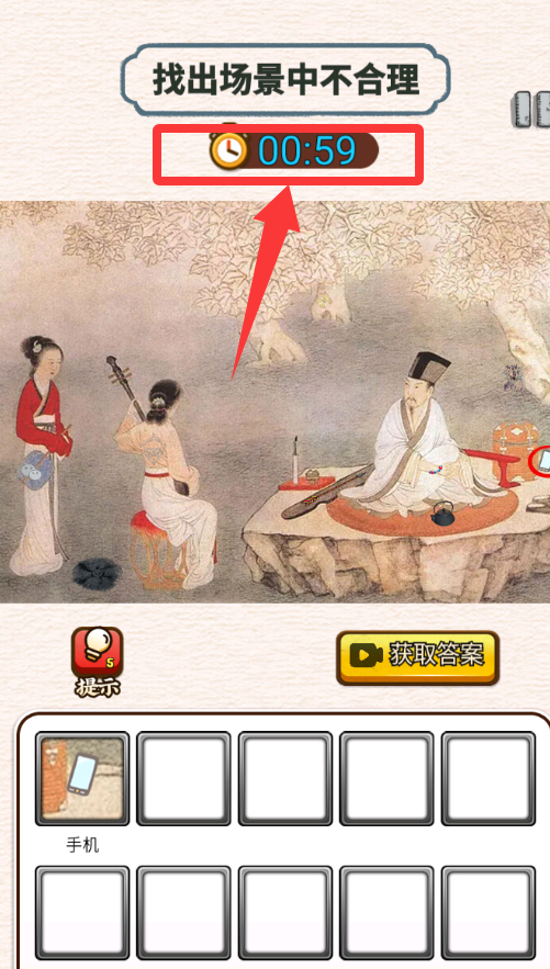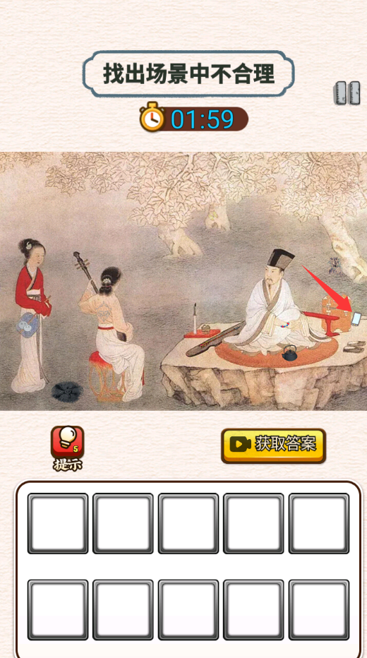3、找出场景中的不合理,红色箭头那里有个手机是不合理的。