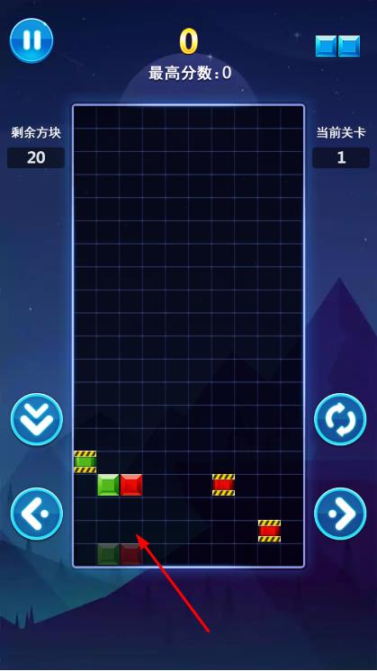 2、在关卡界面,会显示剩余方块数量和当前关卡信息,根据不同的消除玩法,通过点击屏幕左右两侧的方向按钮,调整方块的位置和排列。