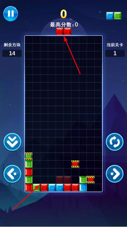 3、在消除过程中,注意消除带有警示条纹的障碍方块,尽可能多地消除方块来获取分数,上方会显示最高分数。