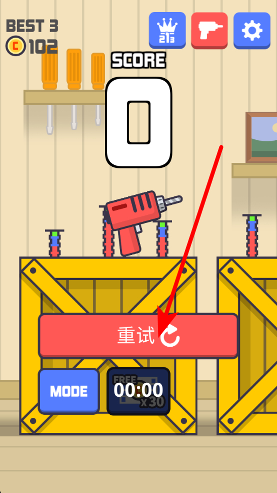 3、在失败界面中,找到标有重试字样的按钮,点击重试按钮,游戏将重新加载当前关卡,玩家可再次尝试操控钻头镶嵌钉子,直至完成。
