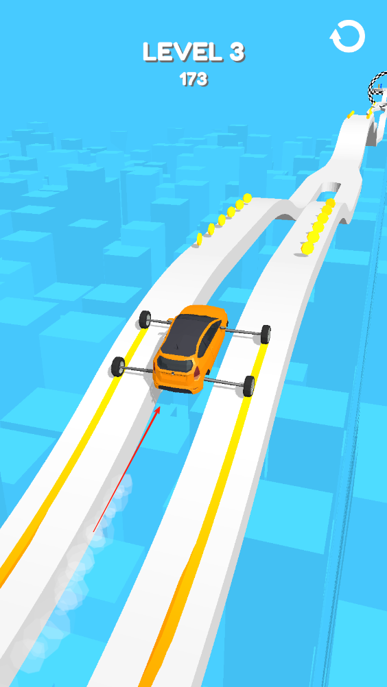 2、根据赛道宽窄、高低变化及时伸缩轮胎,避开障碍、跨越鸿沟,保持汽车平稳前进,收集沿途道具。