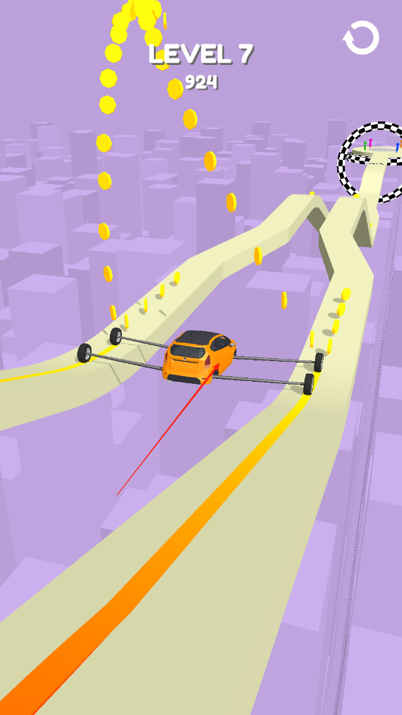 1、轮胎伸缩操控:通过点击或滑动屏幕控制汽车轮胎伸缩,遇到窄路缩短轮胎,跨越宽沟伸长轮胎,精准调整以适应赛道变化,确保汽车顺利通行。