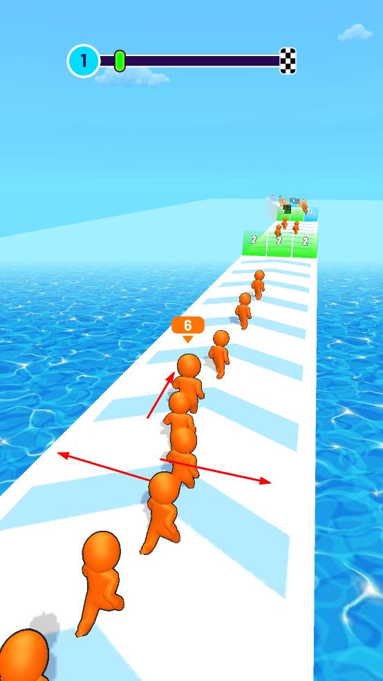 1、操控橙色小人队伍在水上赛道上移动,通过左右移动使队伍聚集或分散,这是开启游戏的关键操作,顺利开启游戏之旅。