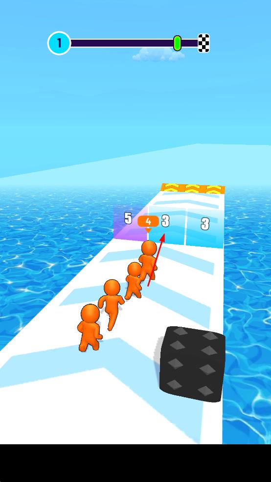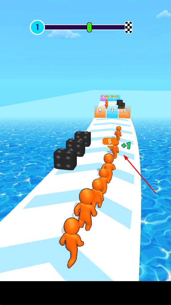 2、队伍经过带有数字标识的区域时,小人数量会根据标识变化,同时注意躲避黑色障碍物,为顺利通过关卡奠定基础。
