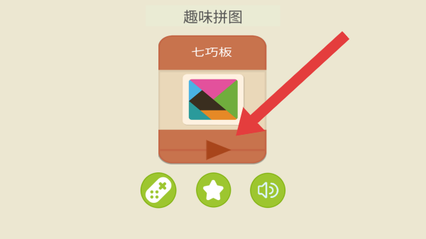 1、展示了七巧板模式,下方有游戏模式手柄图标功能按钮,呈现选择关卡或模式的初始界面。