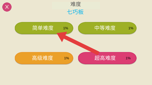 2、难度分类简单、中等、高级、超高难度,各难度完成进度均为1%,呈现玩家选择七巧板拼图难度的环节。