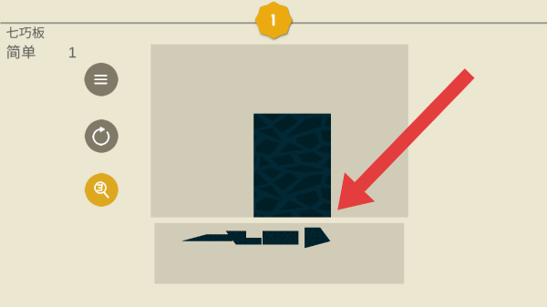 3、显示关卡进度、难度为简单,呈现七巧板拼图的初始拼接状态,需将下方碎片拼合到上方区域。
