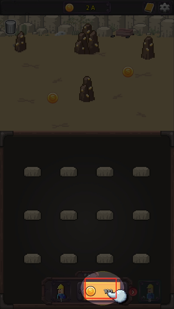 1、进入作品后我们点击底部标有100的金币按钮,消耗对应金币雇佣矿工,为后续矿石开采储备人力。