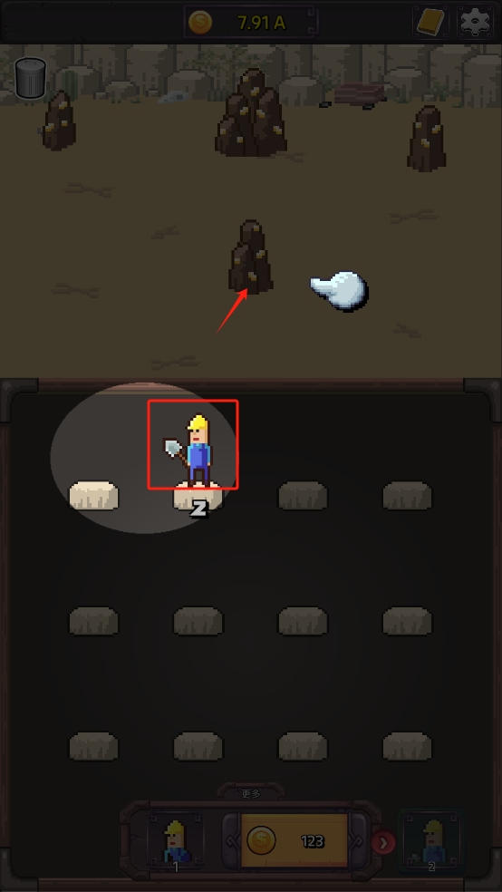 2、雇佣的矿工自动站定在网格位置,随后前往地面红色箭头指向的矿石堆处开展开采,持续积累金币。