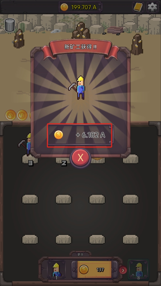 3、获得新矿工后,界面弹出奖励提示,关闭弹窗后,新矿工加入采矿队伍,借助人力扩充提升开采效率。