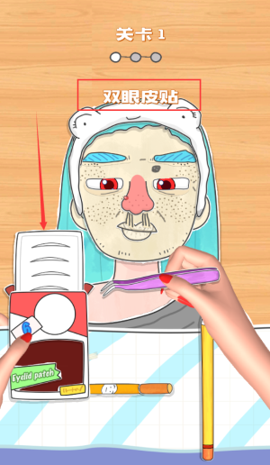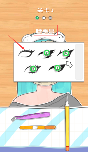 2、用红框镊子夹取双眼皮贴,按照箭头为角色贴上。