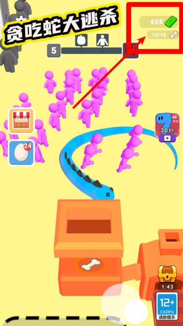 2.右上角显示当前拥有的金币数量与骨头上限,这些资源可用于解锁新功能和强化贪吃蛇的能力。