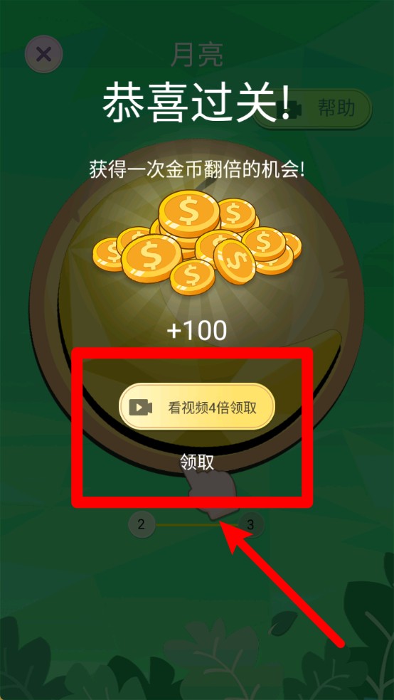 3.通关奖励界面显示成功过关提示,玩家可通过观看视频获得金币翻倍的机会,并可直接点击领取按钮领取奖励。