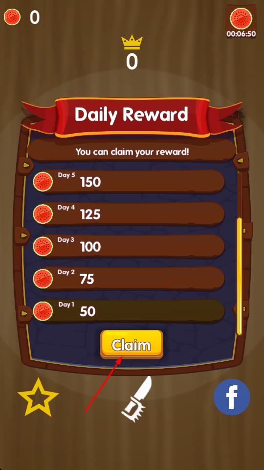 1、界面显示DailyReward时,点击Claim按钮可领取对应天数的西瓜奖励,积累资源助力后续挑战,开启每日福利获取流程。