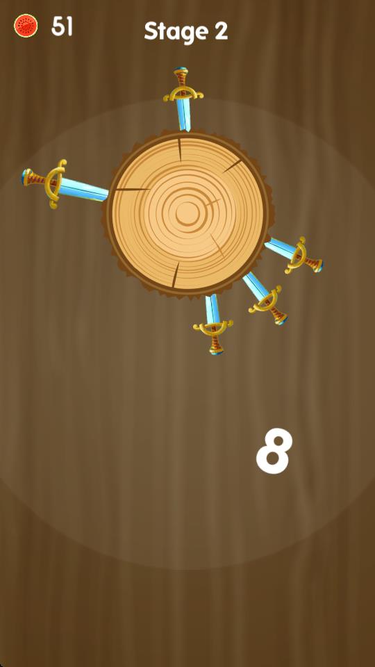 2、进入Stage关卡,观察木桩上已有飞刀布局,把握时机点击屏幕投掷飞刀,需规避碰撞,成功插入木桩以推进关卡进程。